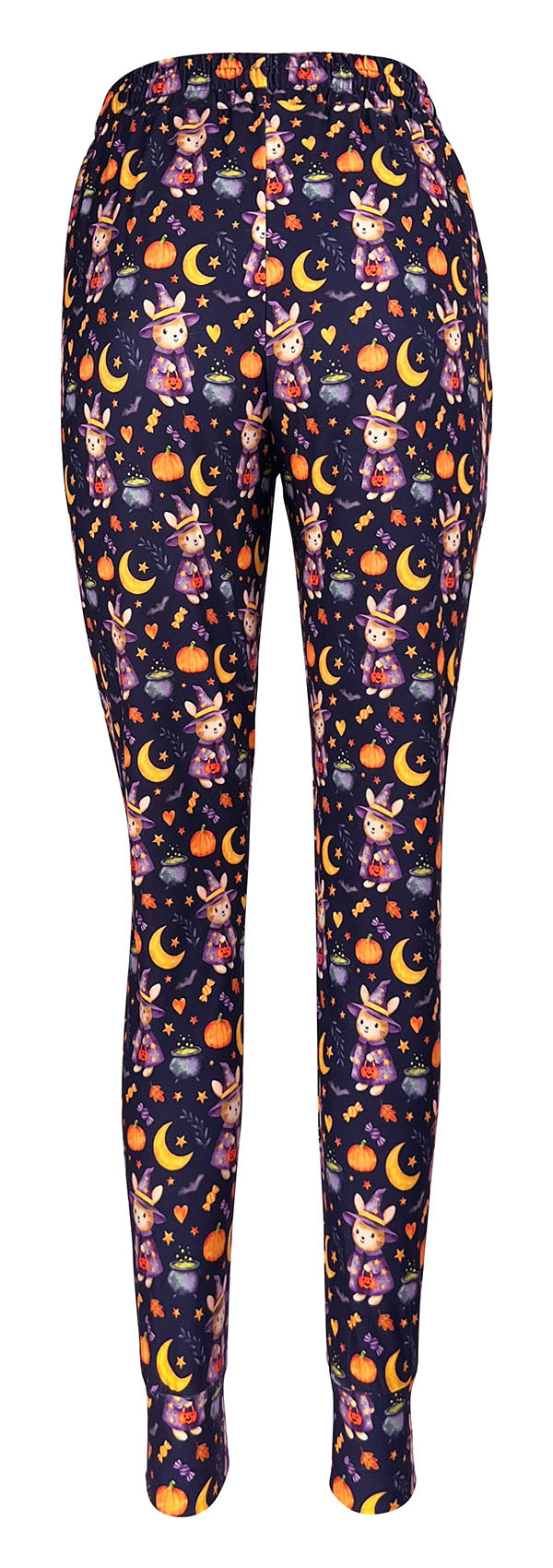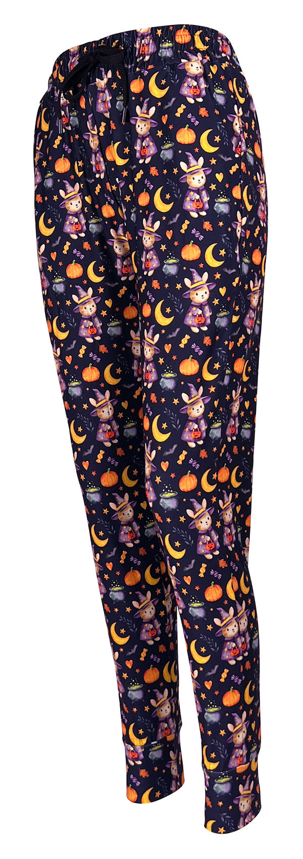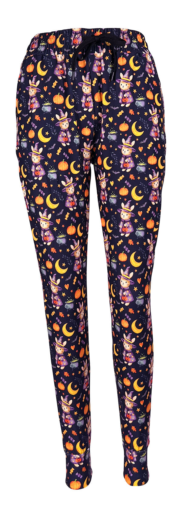 Stay cosy while celebrating the season with our Bewitching Bunny Joggers. Featuring a cute witch bunny print with pumpkins and candy, they bring playful personality to your casual wardrobe.
