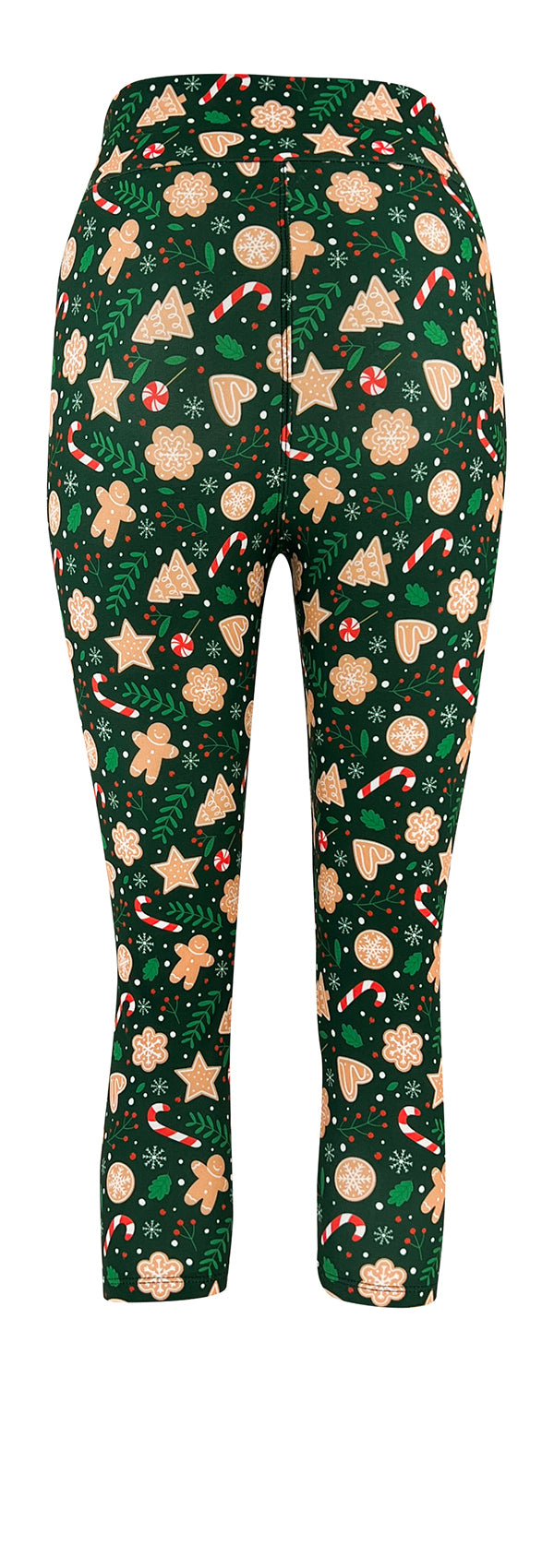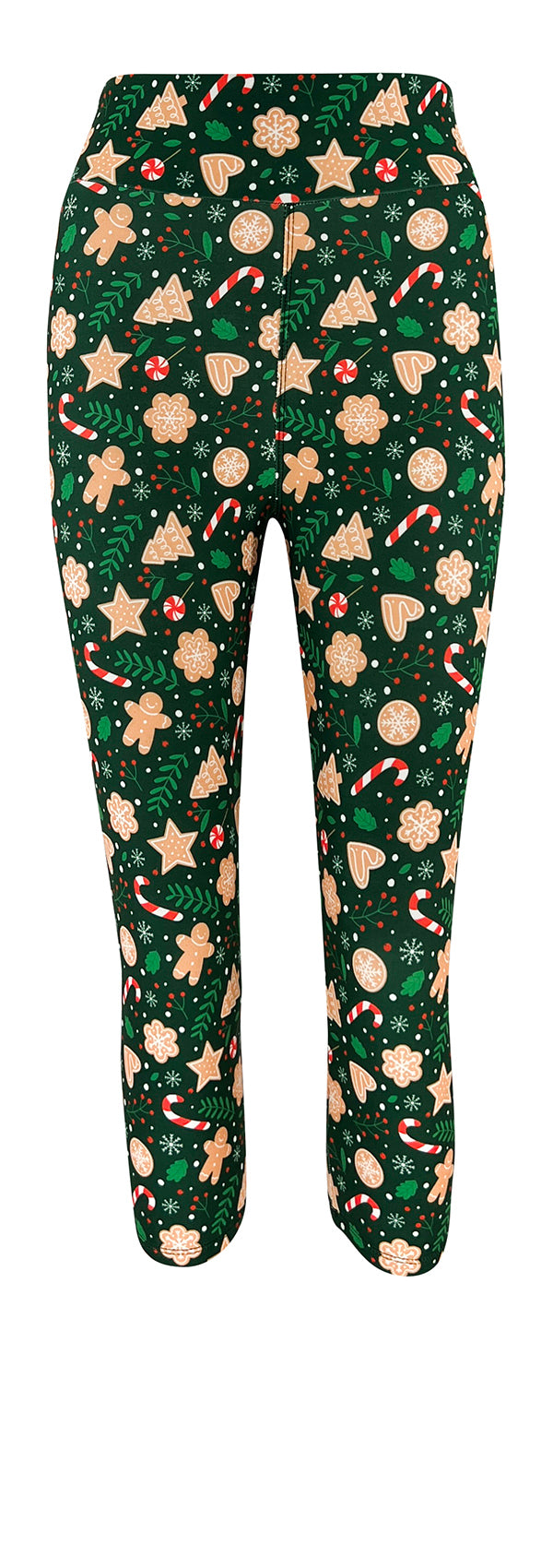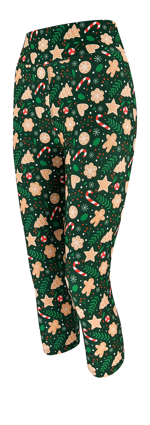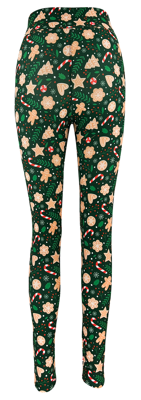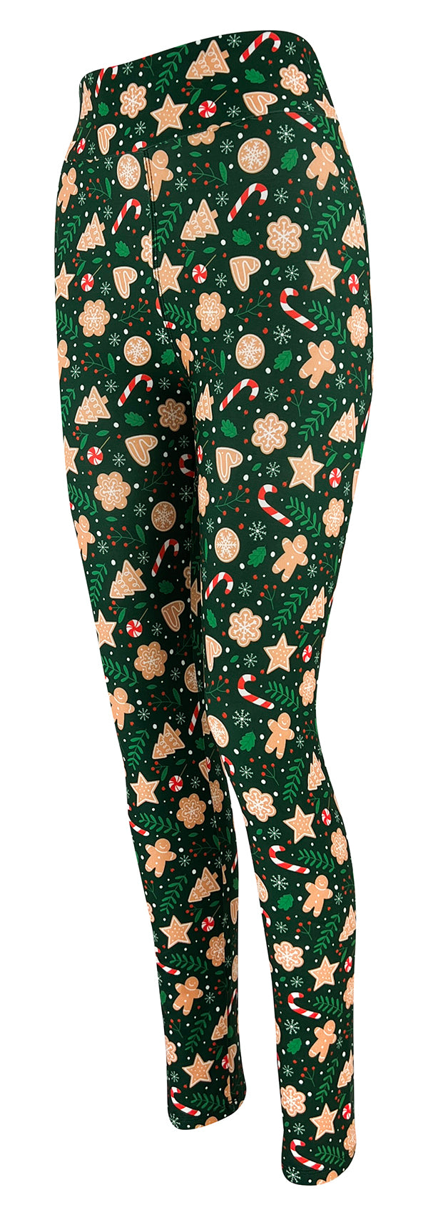 Our Christmas Cookies Leggings are baked to perfection! This delightful pattern of gingerbread men, stars, and various holiday cut-outs on a deep green background is printed on our stretchy, buttery-soft fabric.