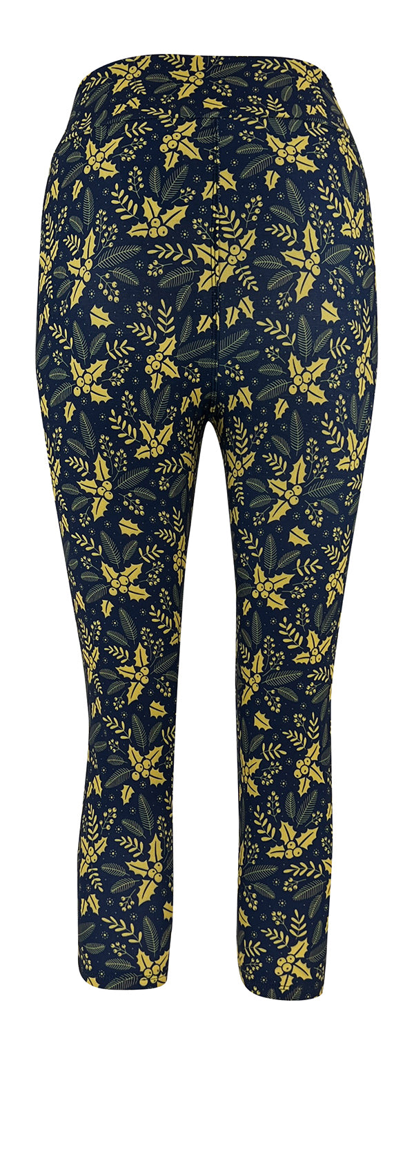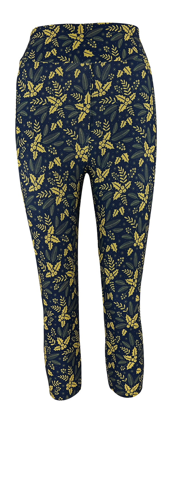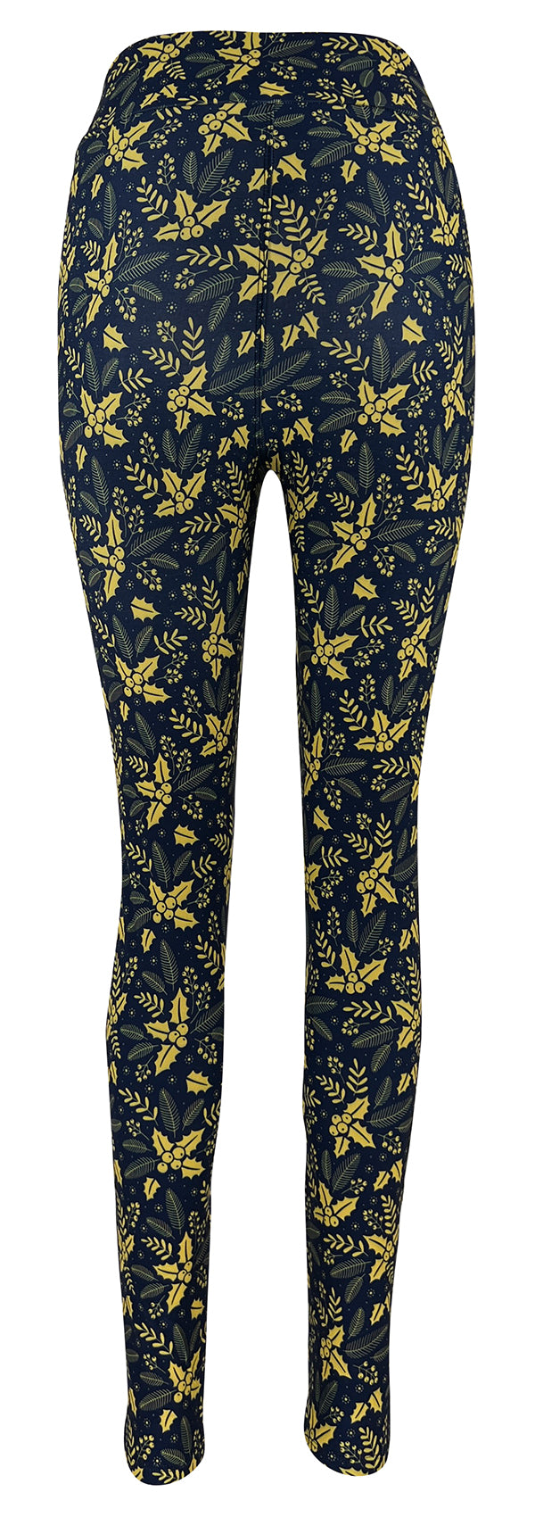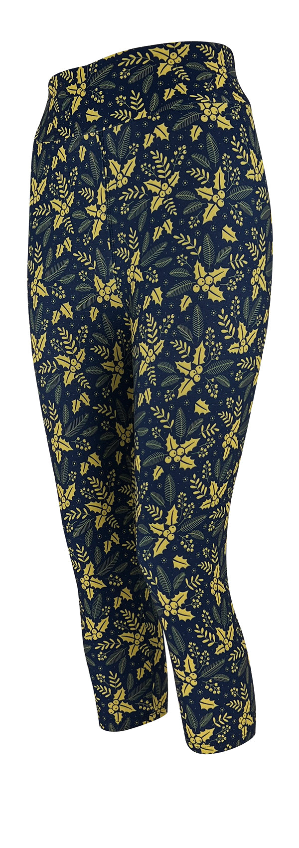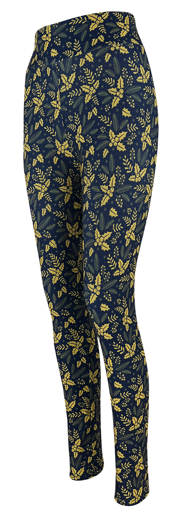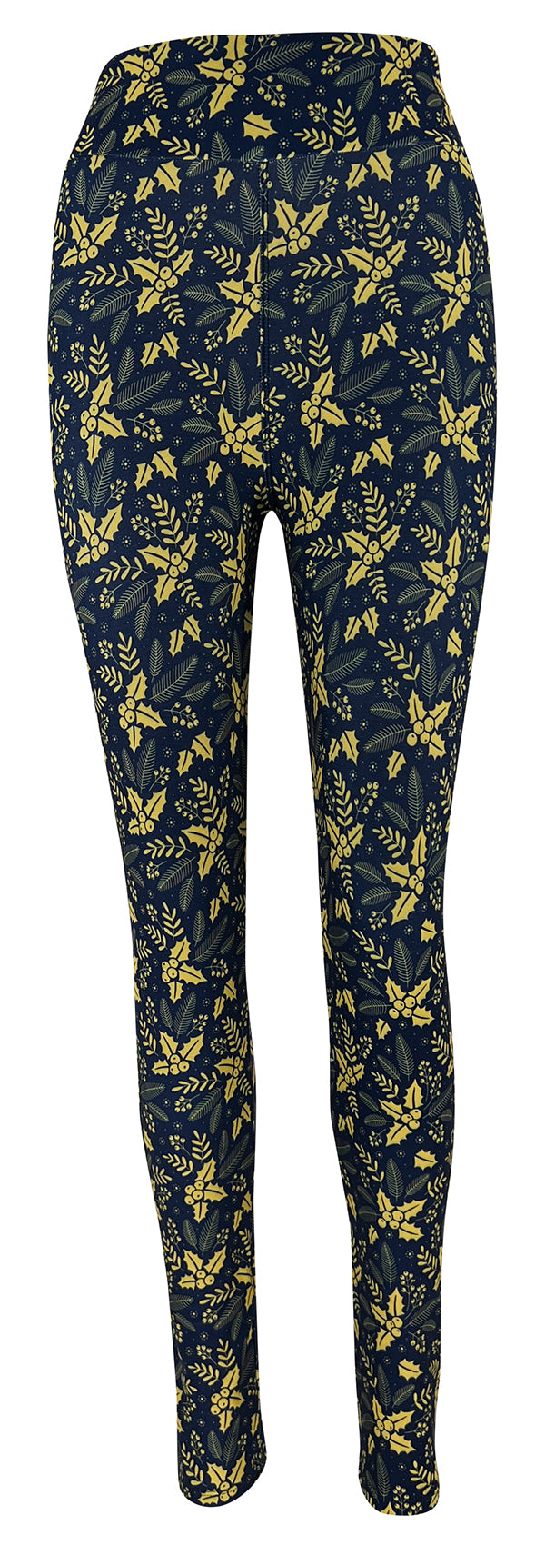 Wrap yourself in elegance with our Golden Holly Leggings. This luxurious navy and gold holly print, detailed with subtle berry vines, is on our super soft, stretchy fabric.