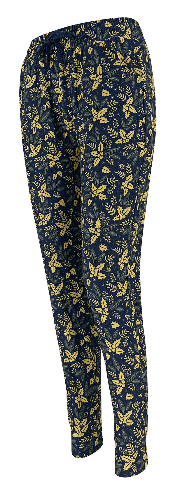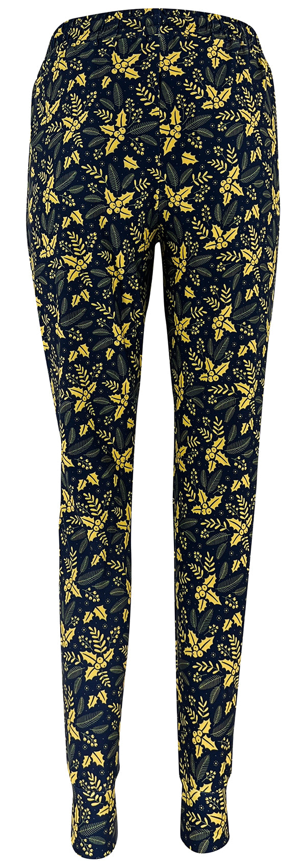 Stay comfortable and chic in our Golden Holly Joggers. This elegant navy and gold holly print is on a super-stretchy fabric for ultimate comfort.