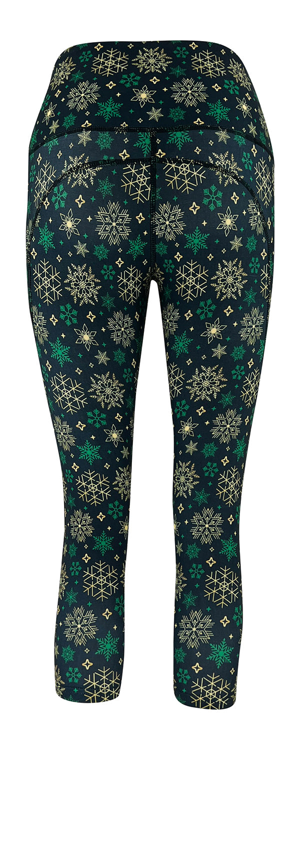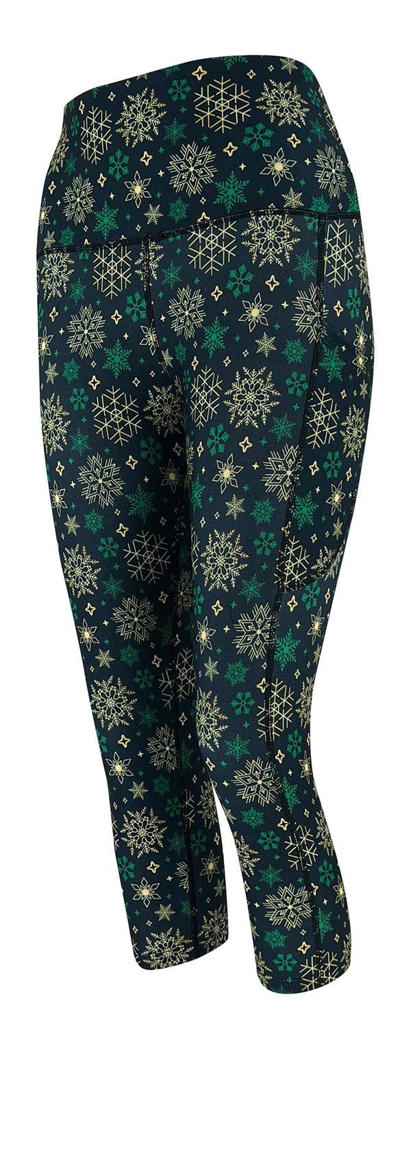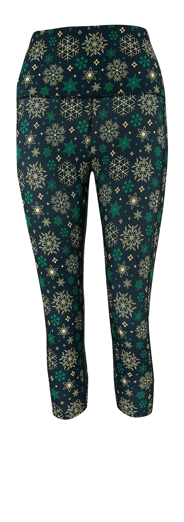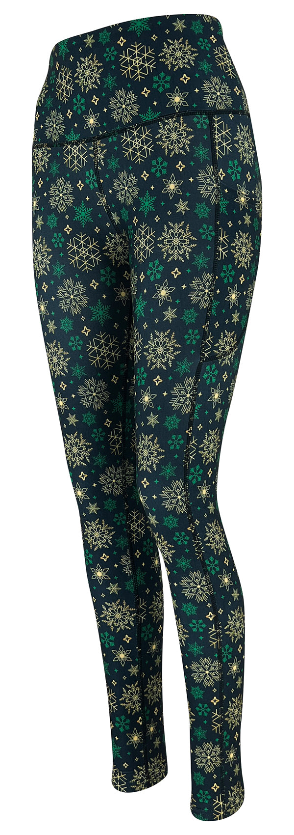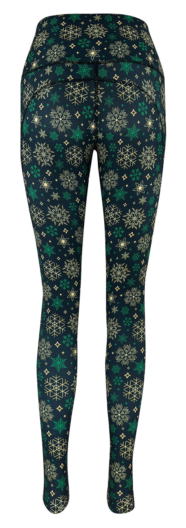 Shine bright in our Emerald Snow Pocket Leggings! This elegant design features gold stars and emerald snowflakes on our comfortable stretchy fabric.