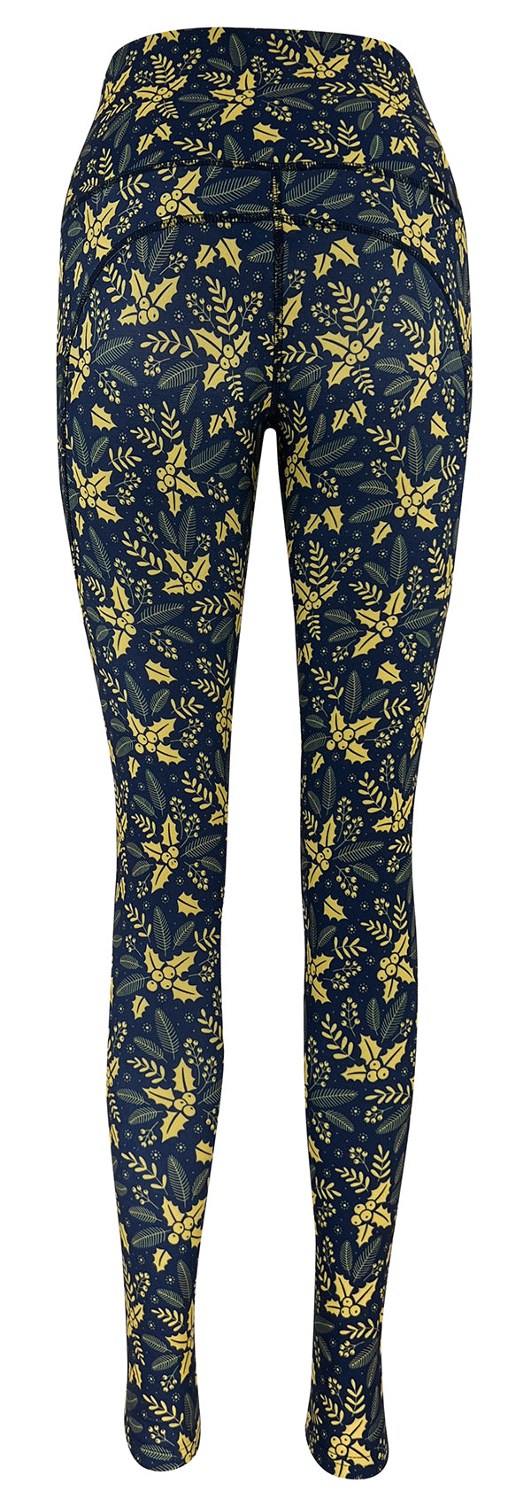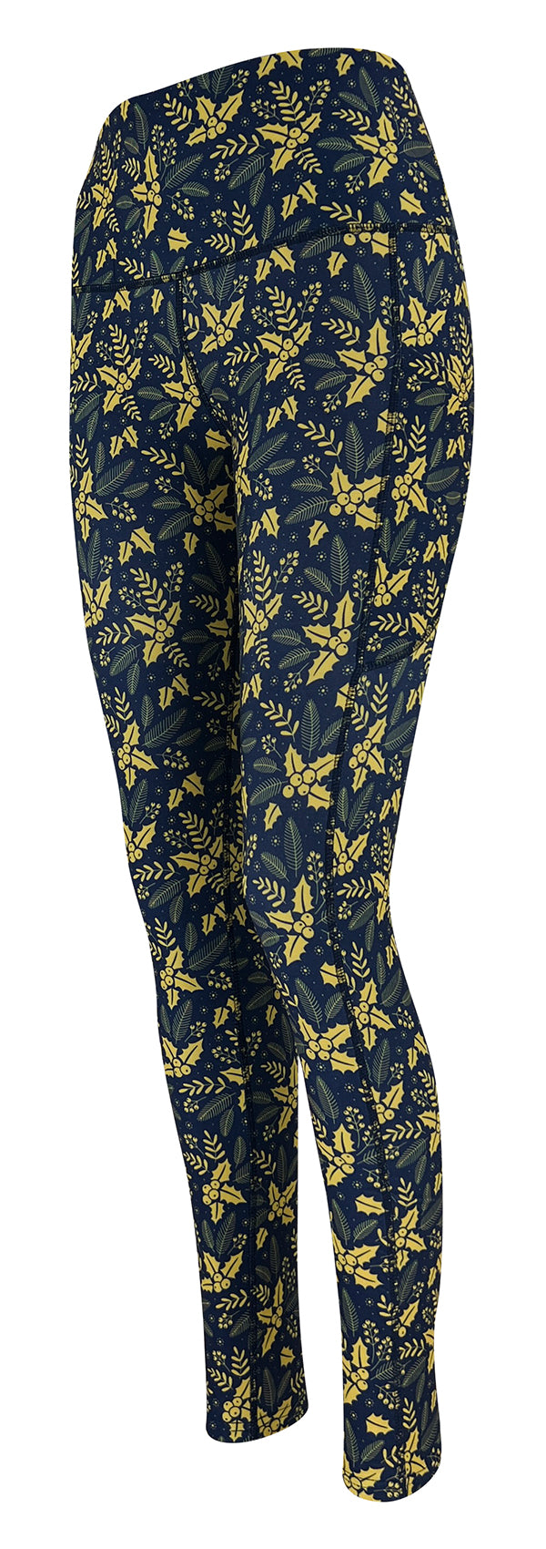 Wrap yourself in elegance with our Golden Holly Pocket Leggings. This navy and gold holly print is on supportive stretchy fabric for comfort and style.