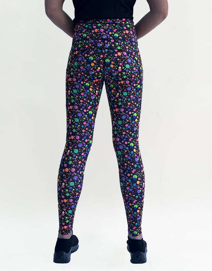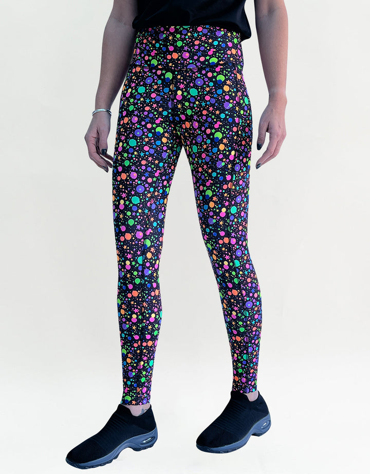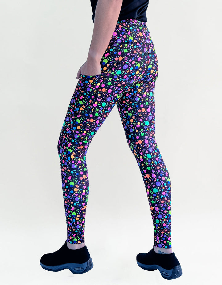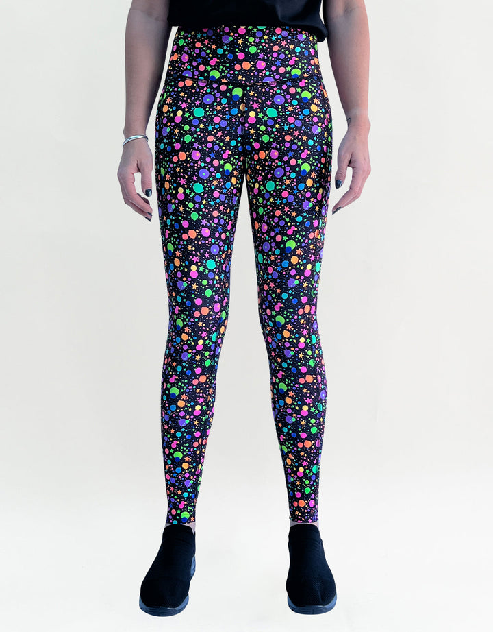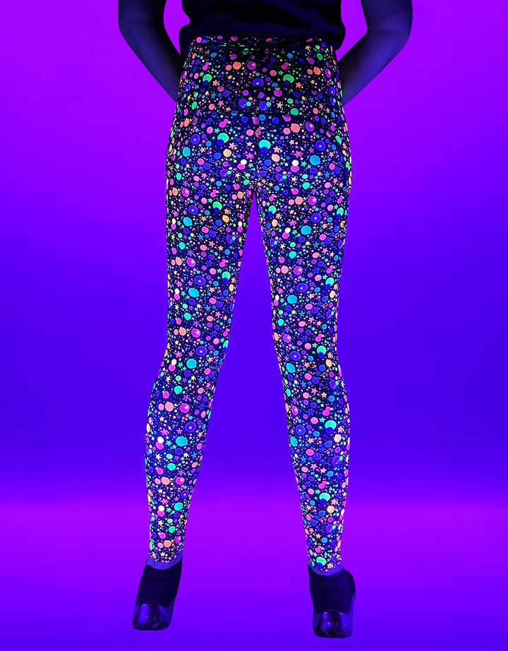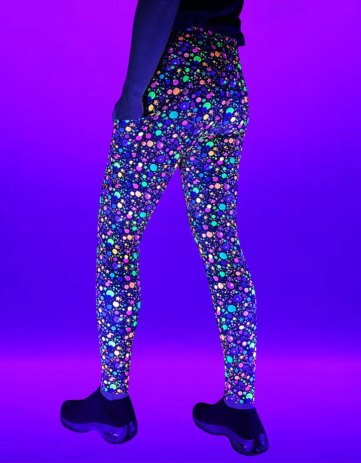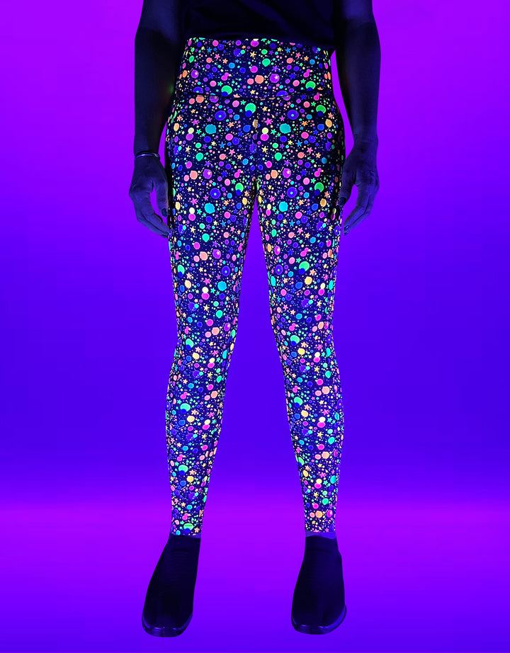 Step into the spotlight with our Neon Nights UV Reactive Gym Leggings. Designed to shine as brightly as you do. These high-waisted, squat-proof leggings feature a vibrant cosmic pattern that bursts into glowing neon under UV and blacklight, making them perfect for gyms, festivals, dance classes, and night events.