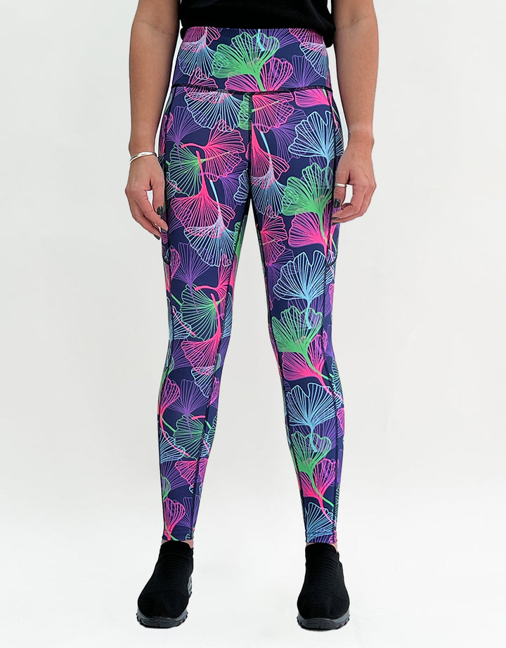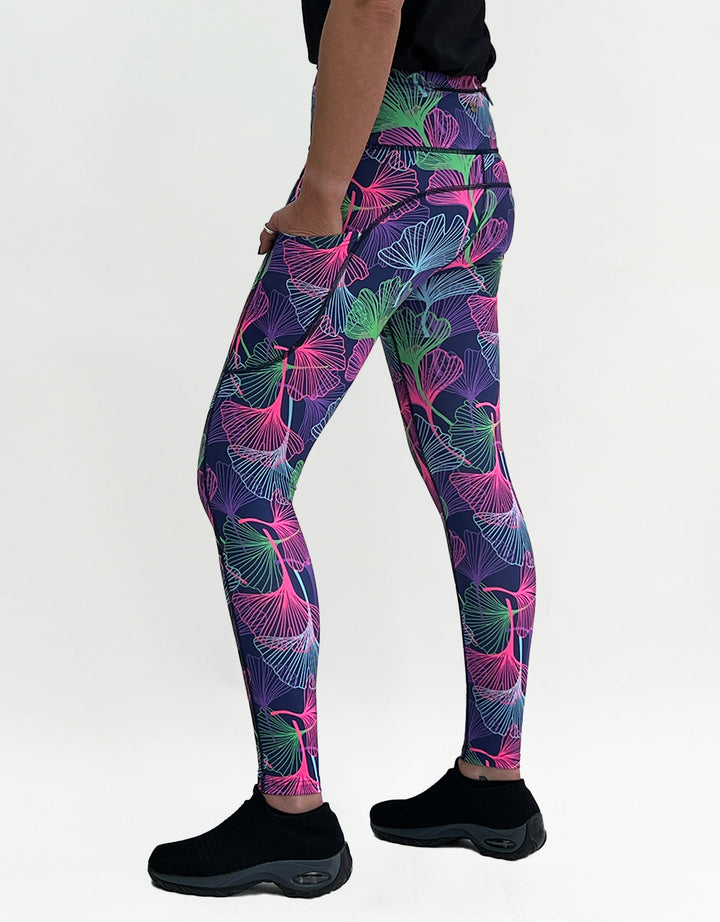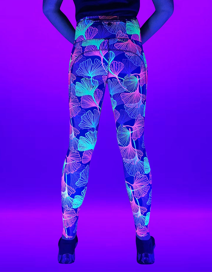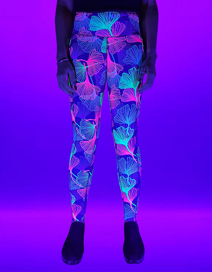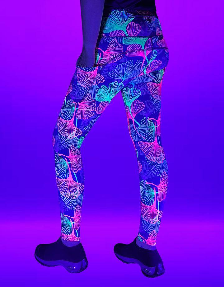 Bring paradise to every workout with our Paradise Glow UV Reactive Gym Leggings. Featuring a vibrant leafy design, these leggings transform under UV and blacklight; illuminating in neon pinks, greens, and blues for an eye-catching glow at gyms, studios, festivals, and night events.