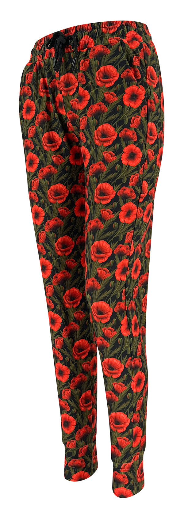 Lounge in style with our incredibly soft Poppy Fields Joggers. This striking design features a vibrant, realistic red poppy field pattern set against a dark background. With a relaxed fit, a secure drawstring waist, and comfortable cuffs, these joggers are perfect for cosy evenings or casual days out.