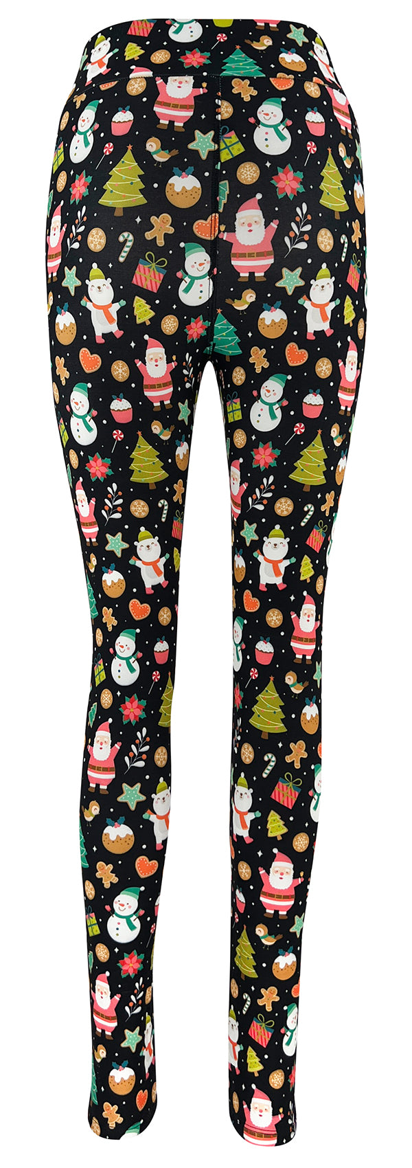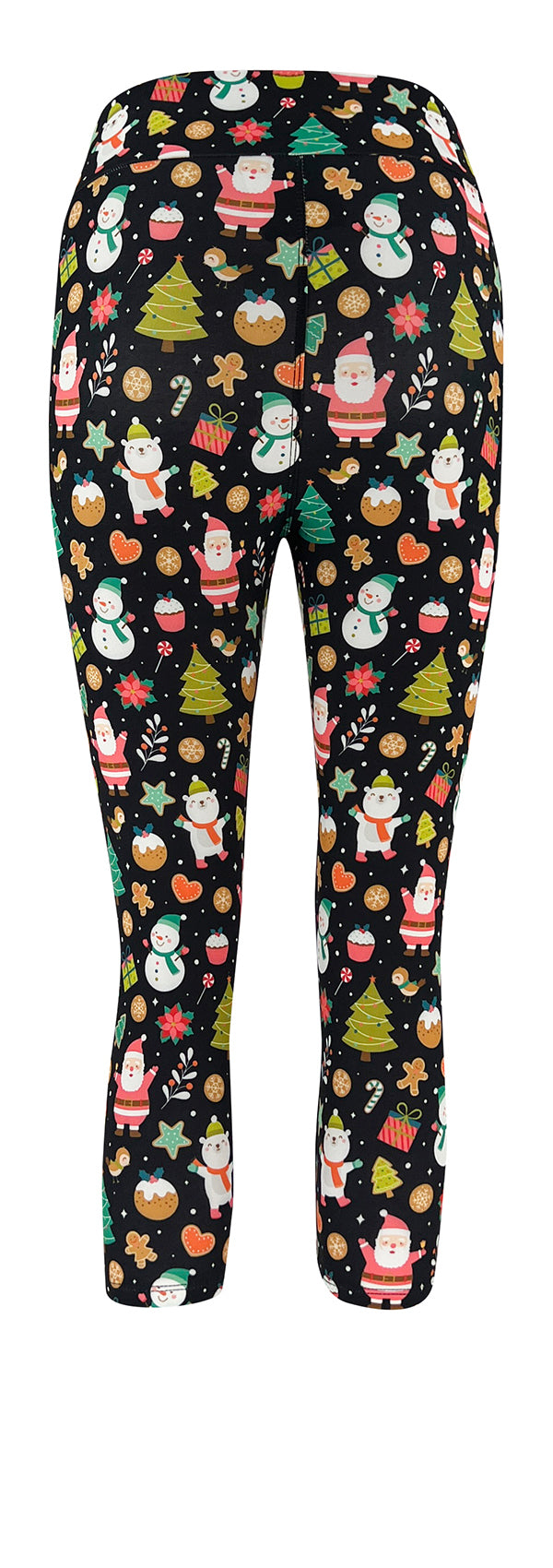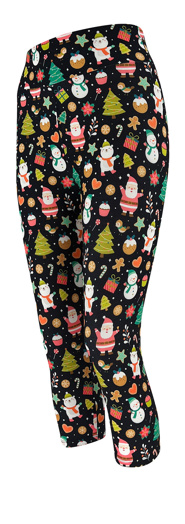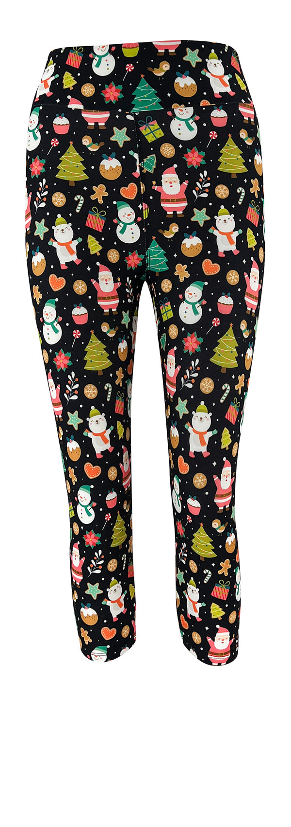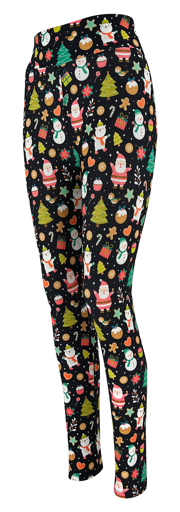 Enter a festive world with our Santa's Wonderland Leggings! This cheerful print features snowmen, gingerbread, and colourful trees on a dark background.