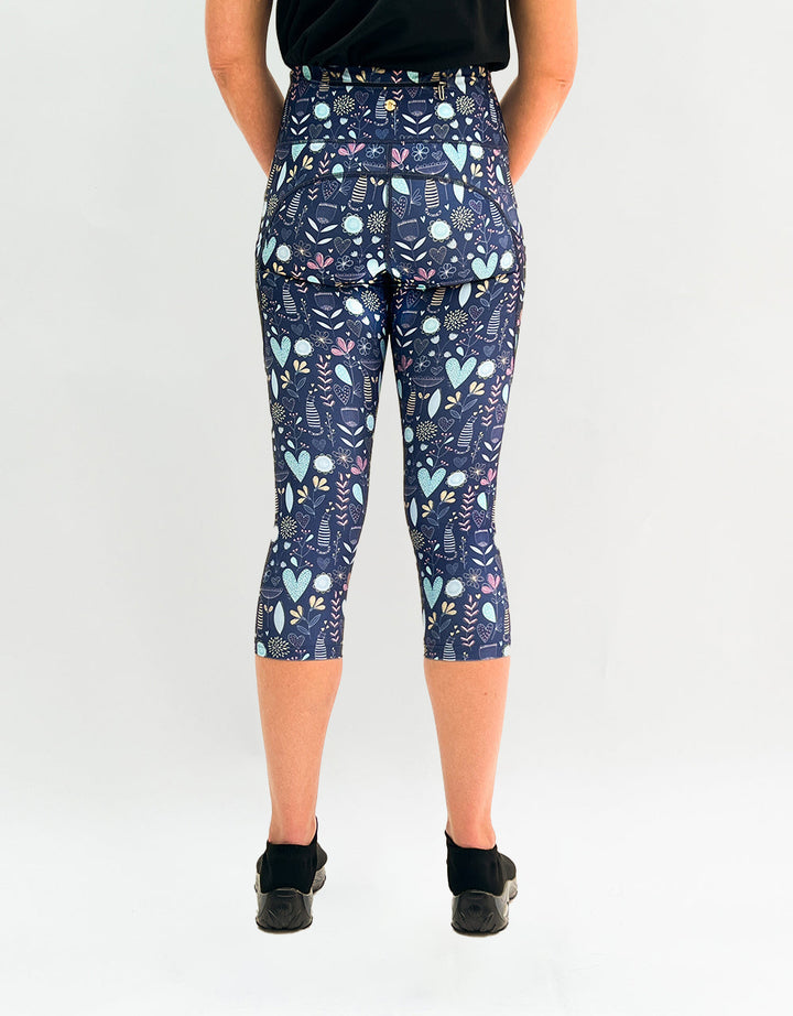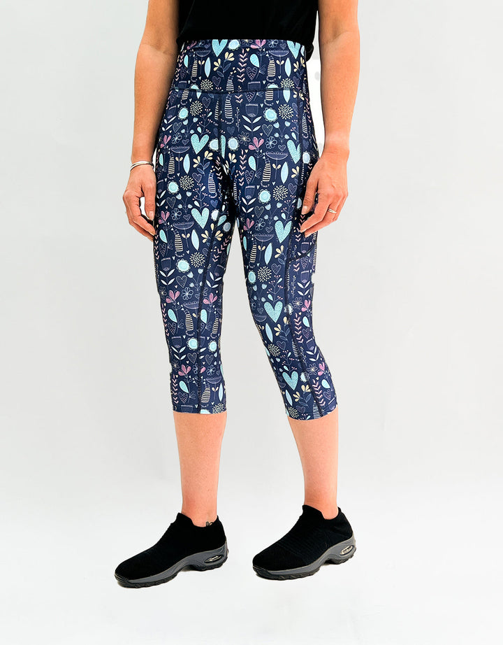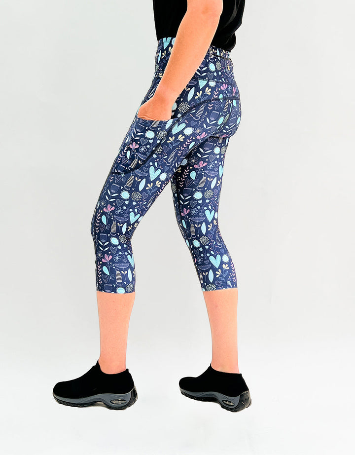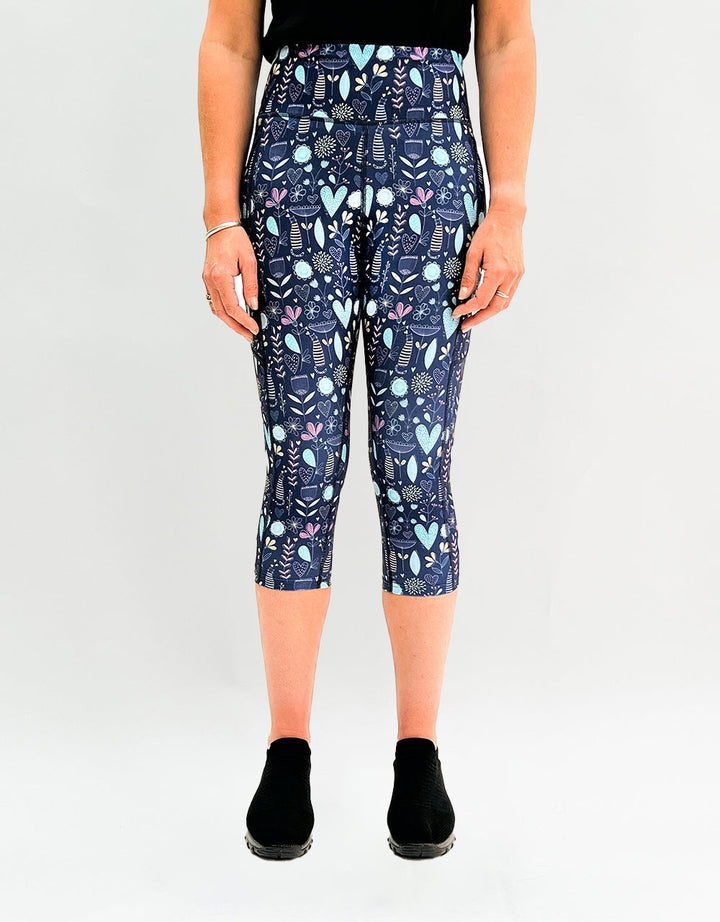 Bring some cheerful charm to your wardrobe with our Wildflower Whiskers leggings. Designed for lovers of playful prints, these leggings combine comfort and cuteness in the best possible way. Striped kitties, floral accents and heart-shaped details all dance across a soft blue backdrop to create a truly lovable design.